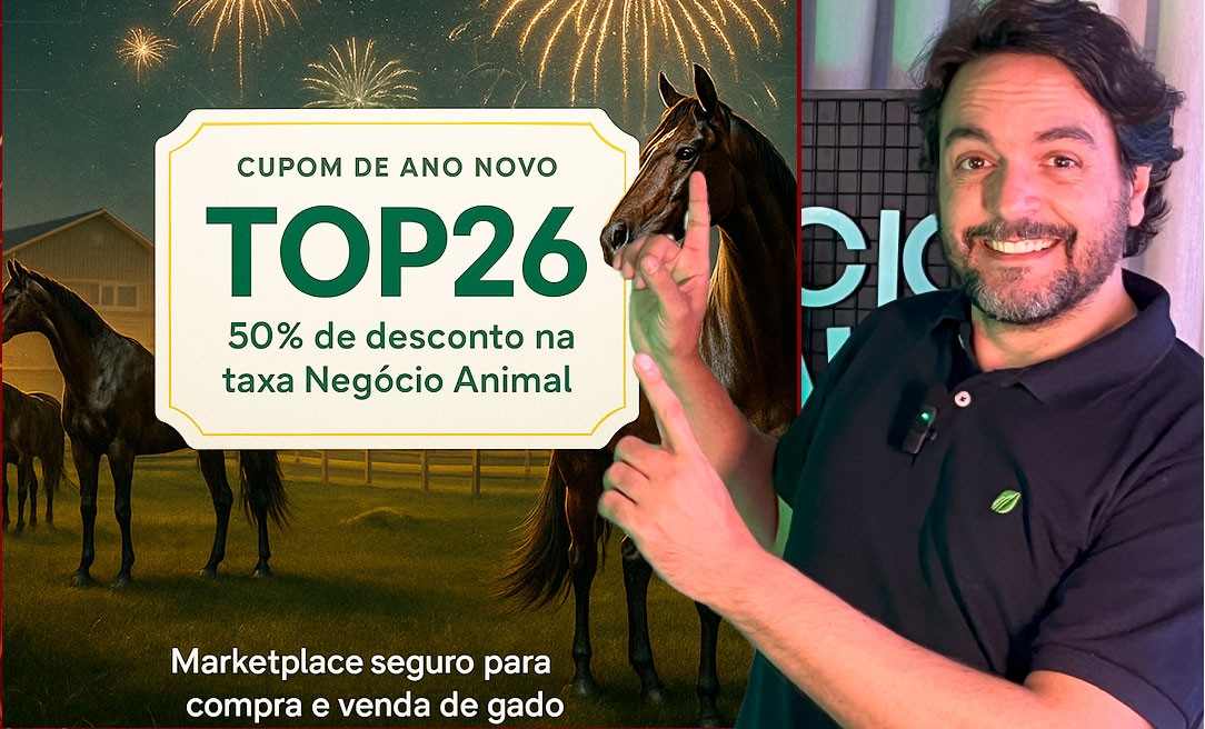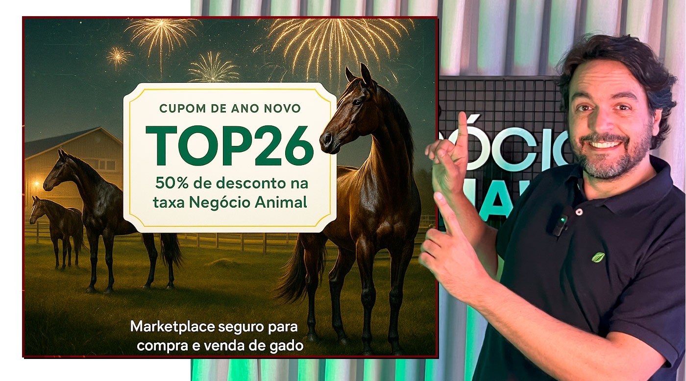 Por isso, liberamos o cupom exclusivo TOP26: uma condição imperdível de 50% de desconto na nossa taxa de remuneração. É a chance única de comprar ou vender cavalos e bovinos com a segurança que você já conhece, pagando apenas metade da taxa da plataforma.